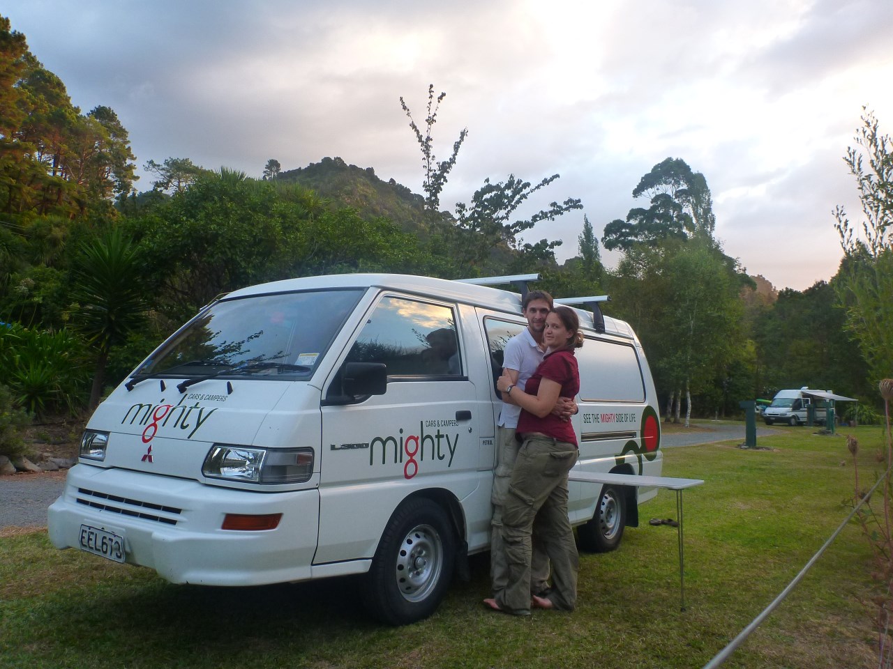 Vraiment petite ! Oui nous avons bien récupéré notre campervan chez Mighty après un passage en douanes sans encombres (même leur petit chien sniffeur n'a pas posé problème). Vous verrez donc brièvement l'aménagement de notre intérieur, qui rappelle un peu notre chère Ford Falcon Australienne, mais avec un poil plus de plafond, et un évier à l'arrière (cf gallery). Ci-joint, une photo prise dans notre premier camping, à l'entrée de la péninsule de Coromandel (cf carte).