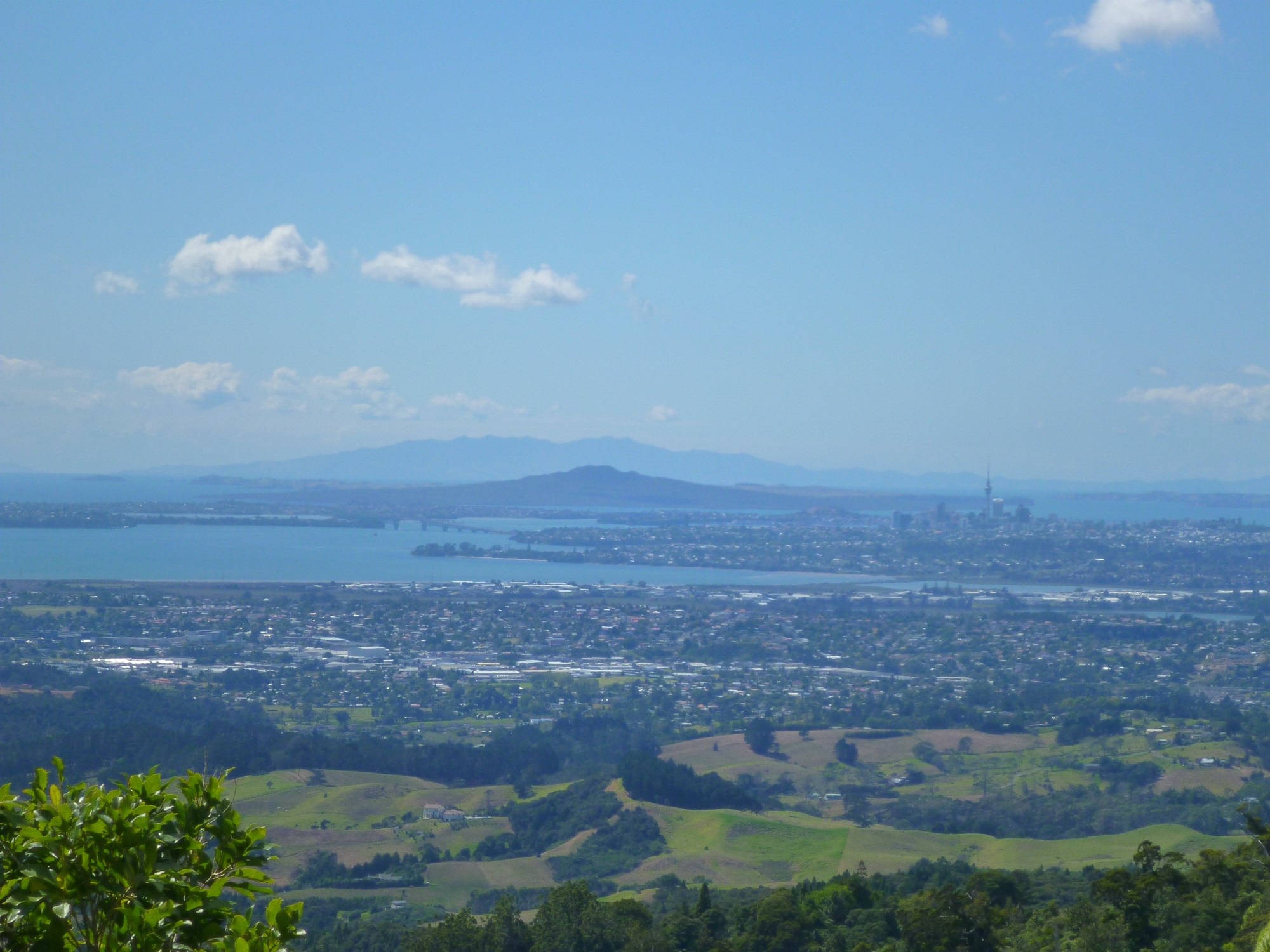 Notre dernier aperçu de la ville d'Auckland et sa haute tour, avec en arrière-plan Rangitoto et les montagnes de Coromandel.