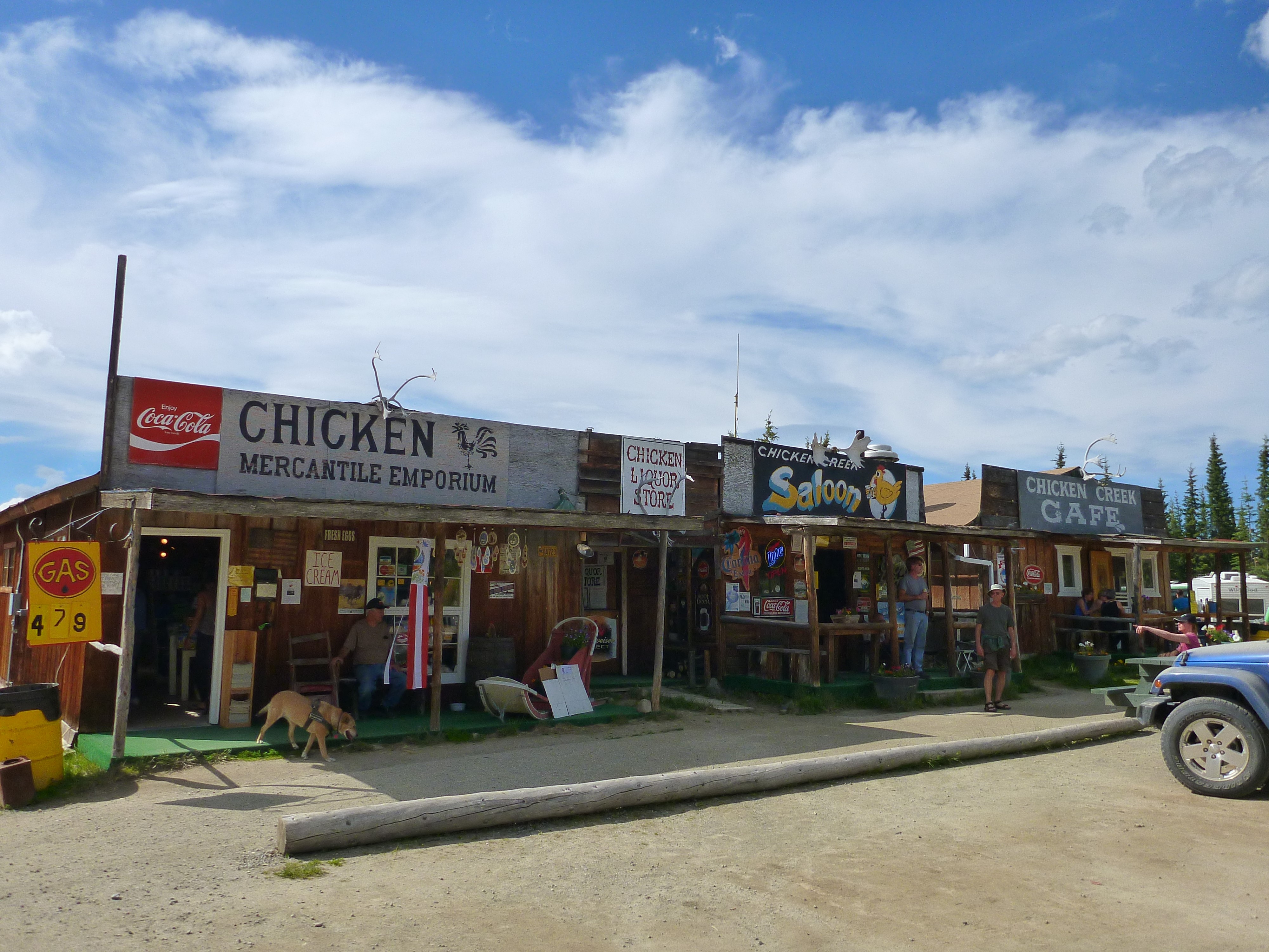 Nous voilà repassé en Alaska, et la première ville atteinte est Chicken ! D'une population d'environ 7 habitants, on y trouve 2 bâtiments : le vieux \"centre-ville\", constitué d'un bar, un café, et un magasin de souvenir, puis le plus récent café/magasin de souvenir qui tient le camping. Elle est aujourd'hui considérée comme ville fantôme d'Alaska, malgré le passage de quelques touristes, qui s'arrêtent pour un café, une photo avec le poulet géant, la visite d'une ancienne drague, ou une leçon d'orpaillage.